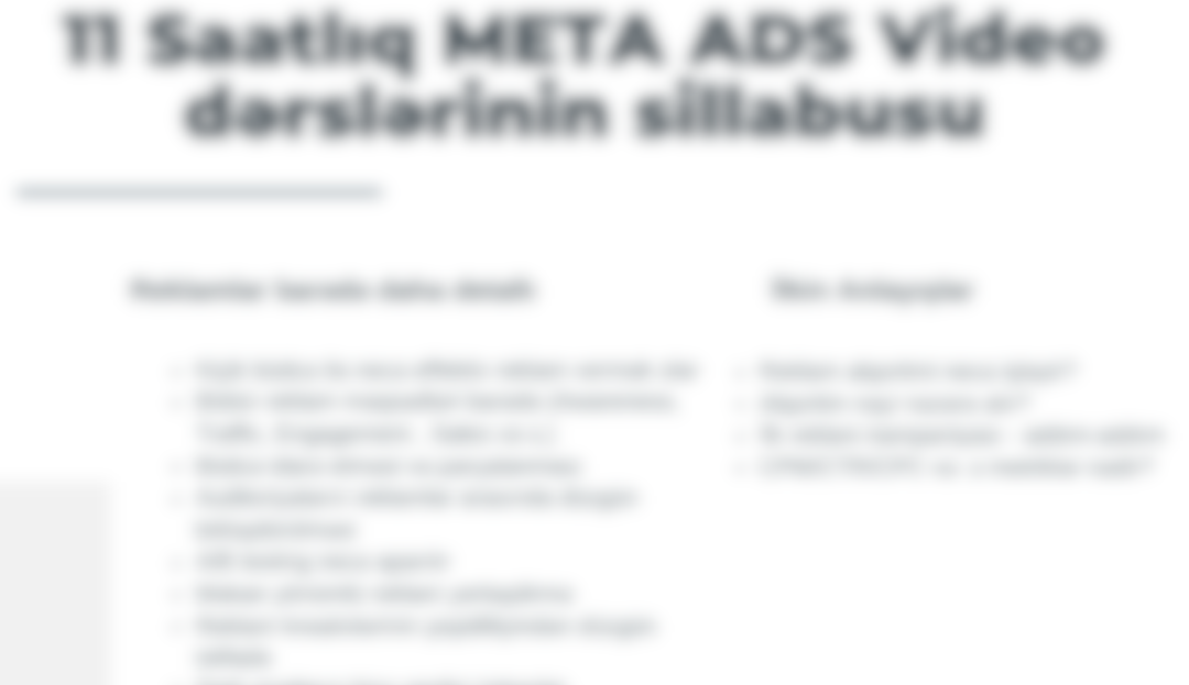 6 illik təcrübəmə əsaslanaraq hazırladığım tam detallı video kurs, reklam büdcənizi daha səmərəli istifadə etməyə və satışlarınızı artırmağa kömək edəcək. Heç bir təcrübə tələb olunmur – 0-dan öyrən və nəticə qazan.